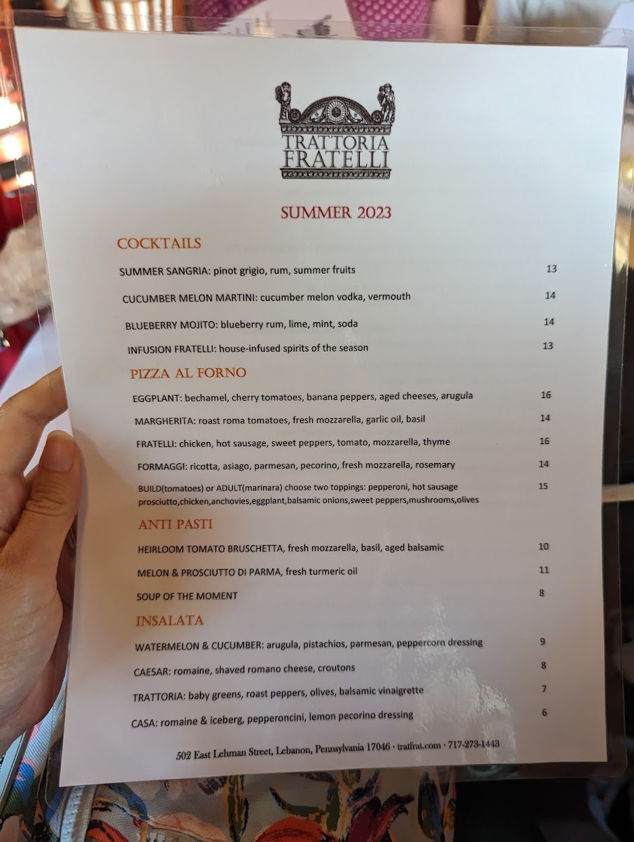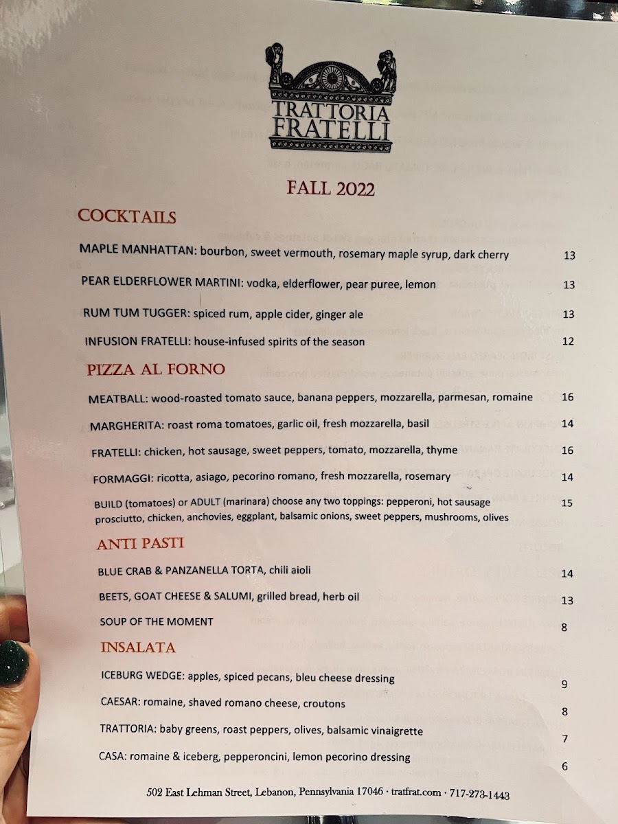 At Trattoria Fratelli Menu, you'll find a delightful selection of Italian-inspired dishes, crafted with fresh ingredients and a genuine love for good food. Whether you're in the mood for a classic pasta, a wood-fired pizza, or a heartwarming Italian appetizer, there’s something for everyone to enjoy. The menu offers a variety of options, from savory pastas that are perfectly al dente to rich, flavorful sauces that’ll transport you straight to Italy. Alongside, the pizzas, made with a perfect crispy crust and topped with the finest cheeses and meats, will surely satisfy any craving. There’s also a great selection of wines to pair with your meal, enhancing each bite with the right touch of refinement. Located in Lebanon, PA, this cozy spot brings a slice of Italy to your table, where every dish is prepared with care and passion.
